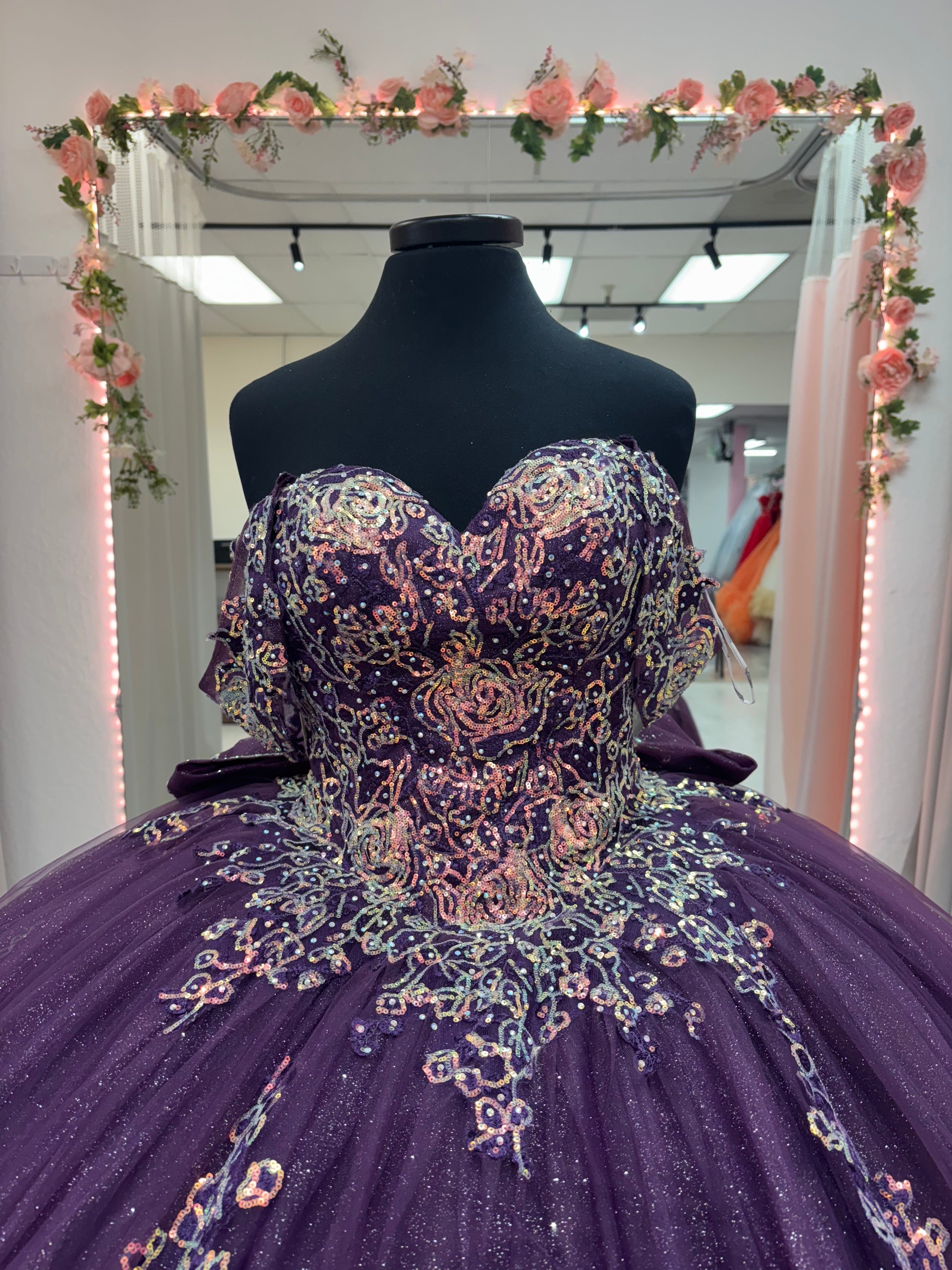 Luxurious deep amethyst ball gown featuring a fully embellished sweetheart bodice with intricate sequin embroidery and crystal bead detailing. The glitter tulle skirt is richly adorned with ornate floral appliqués that cascade throughout the skirt and extend into a dramatic train, creating a bold and regal silhouette. Finished with a lace-up corset back for a secure and adjustable fit, this gown is designed to make an unforgettable statement at a quinceañera celebration.