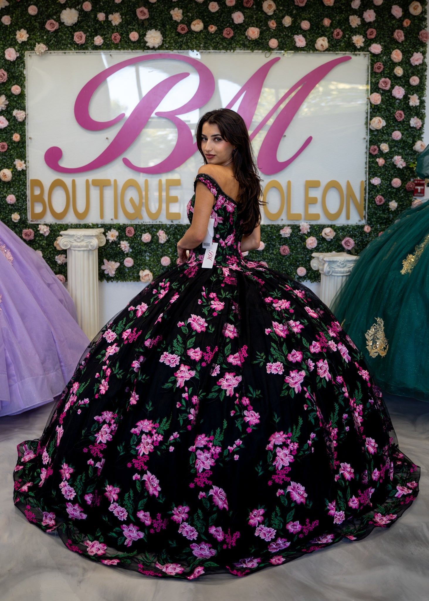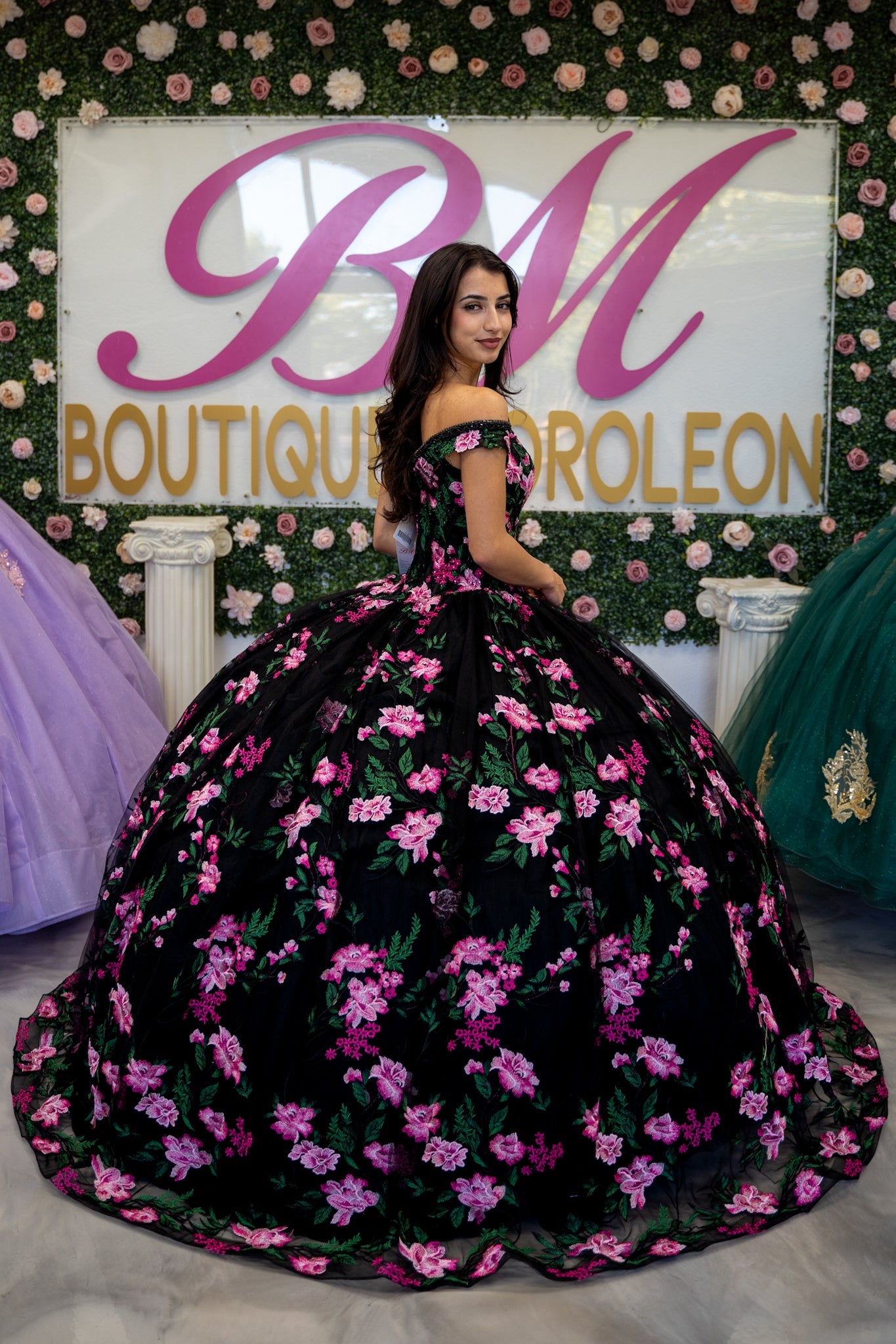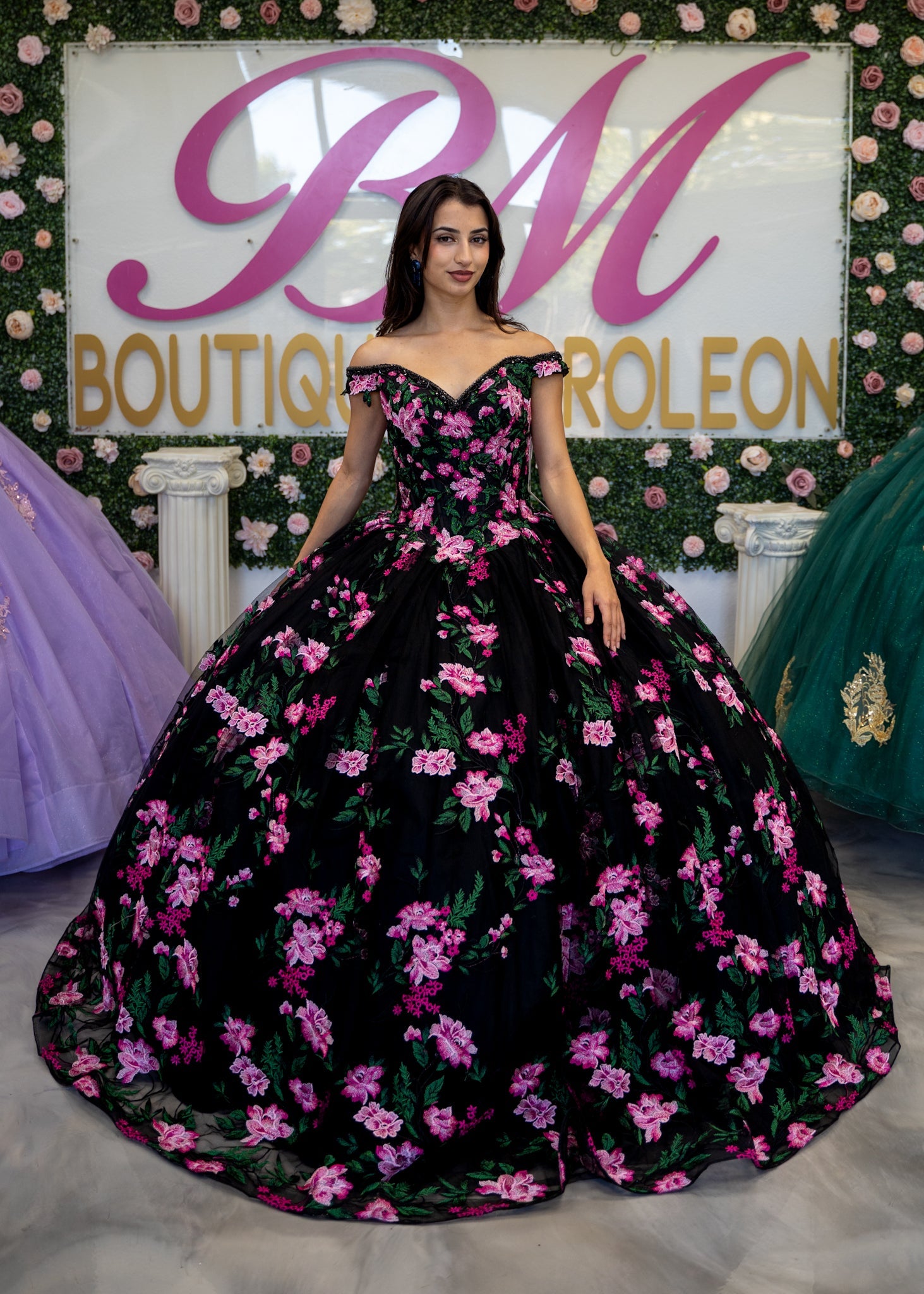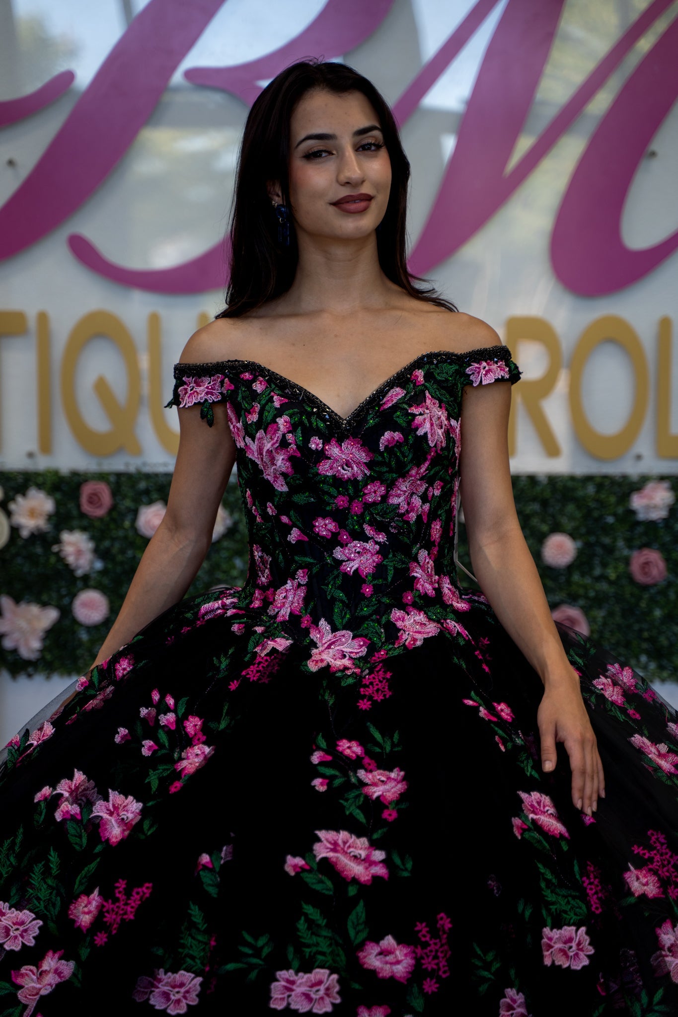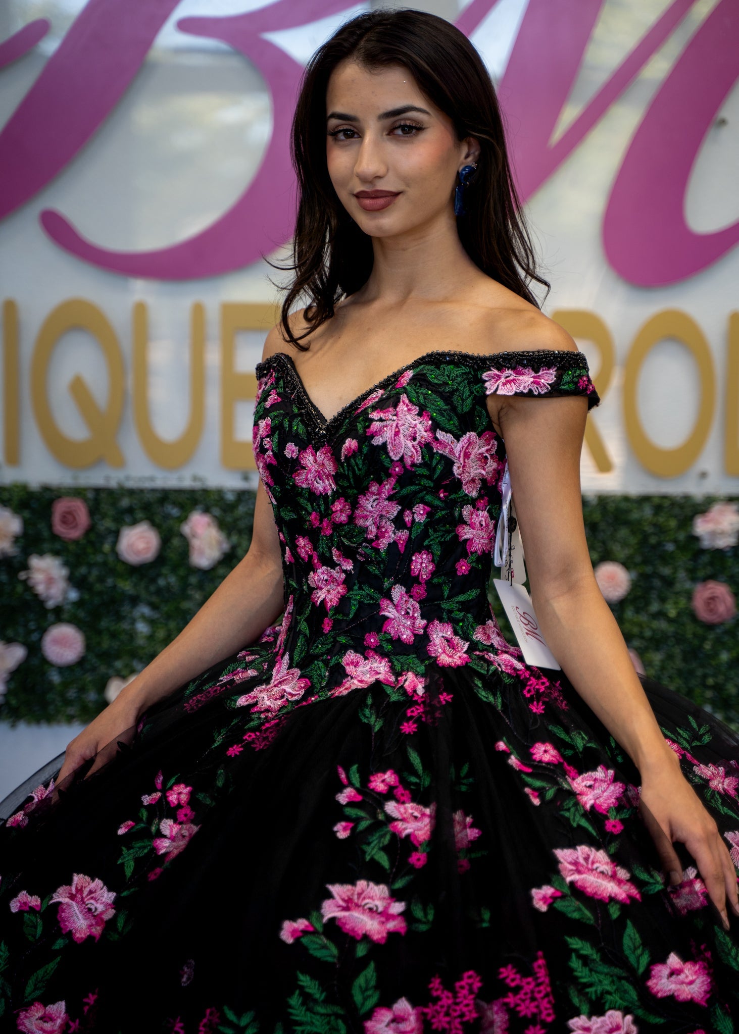 Black/Pink Floral embroidered mesh, with a beaded off-the-shoulder neckline and lace-up back. The Basque waist gives way to the full ballgown skirt.