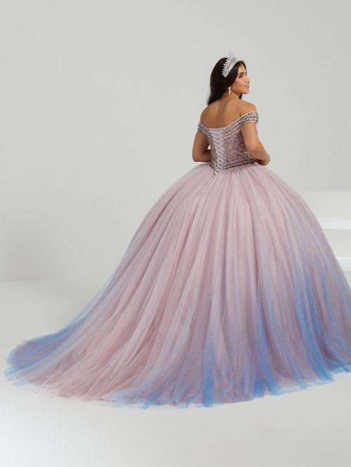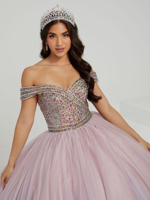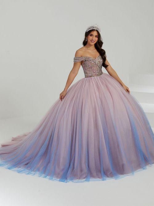 Step into the spotlight with the House of Wu 56475 quinceañera gown! This dazzling ball gown features a radiant glitter tulle skirt in soft ombre layers and a sweep train that flows gracefully behind you. The off-the-shoulder neckline adds a flirty touch, while the fully beaded bodice sparkles with clear crystals—or rainbow iridescent crystals in the pink version—for a magical shimmer. Finished with a lace-up back, this dress promises a perfect fit for your unforgettable celebration.