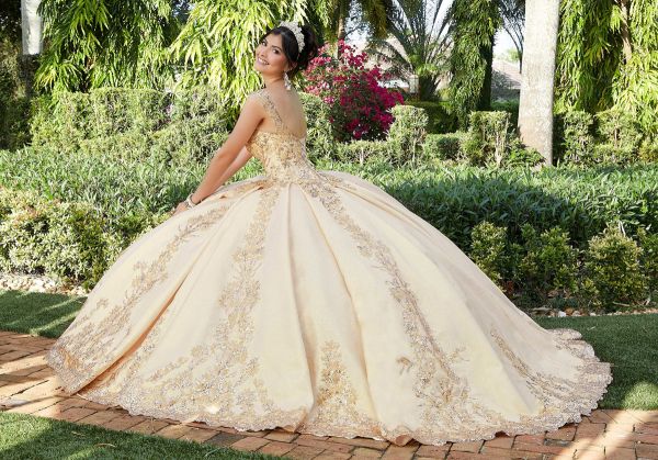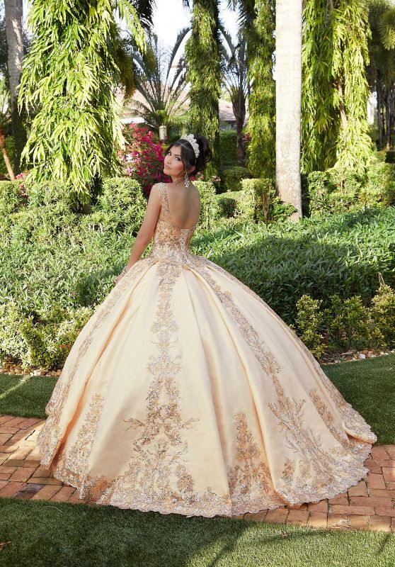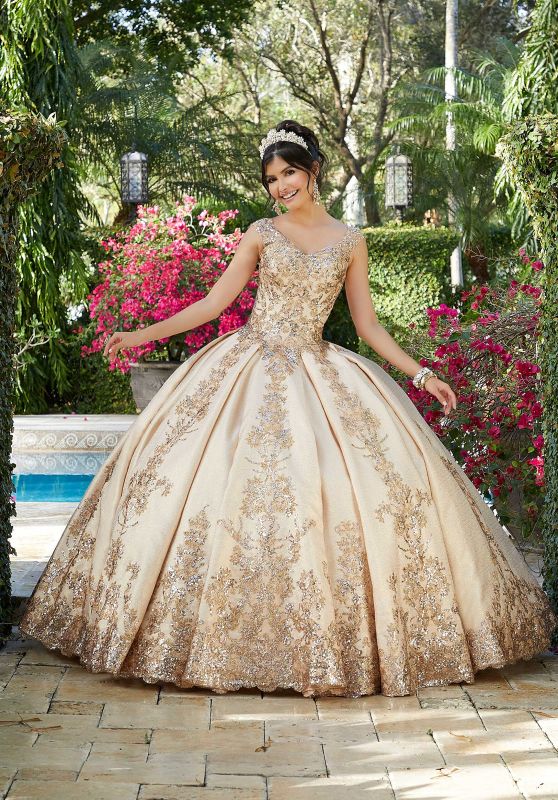 Elegant Quinceanera ballgown featuring sequined, glitter embroidery on metallic box-pleated brocade with scalloped hemline. Matching stole included.