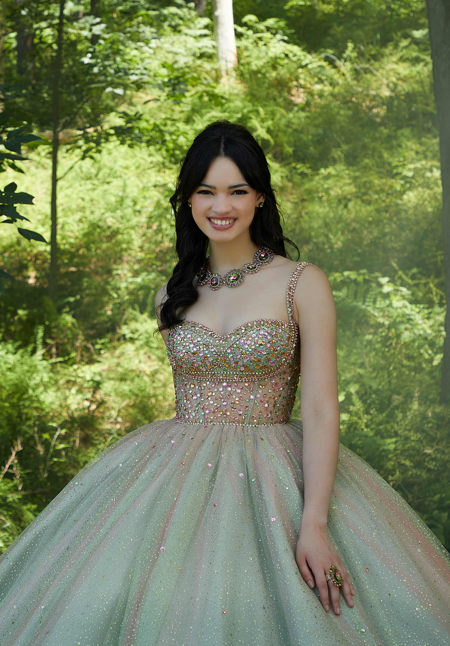Princess ball gown has candy jewel beaded corset bodice with rhinestone trim on patterned glitter tulle.