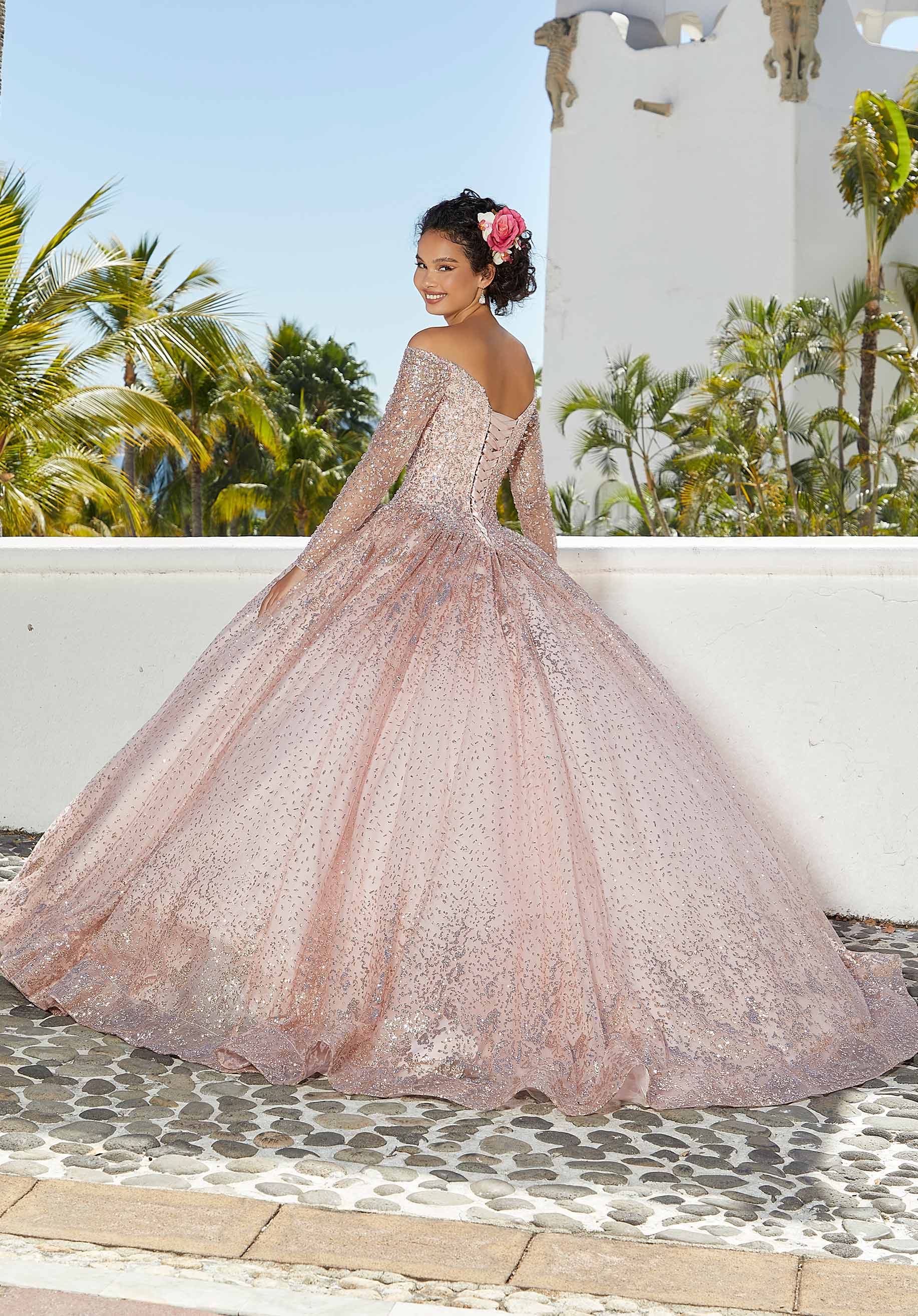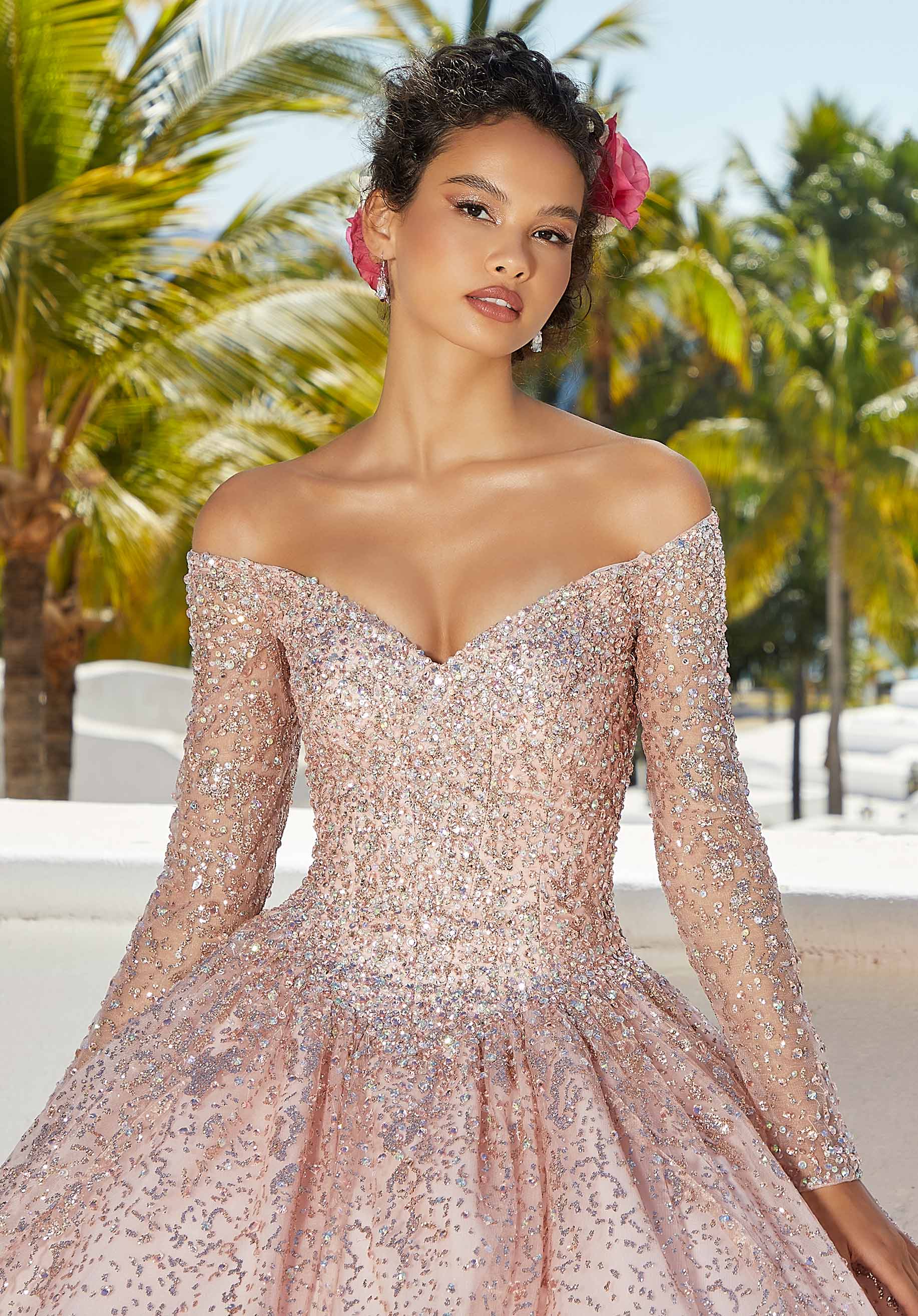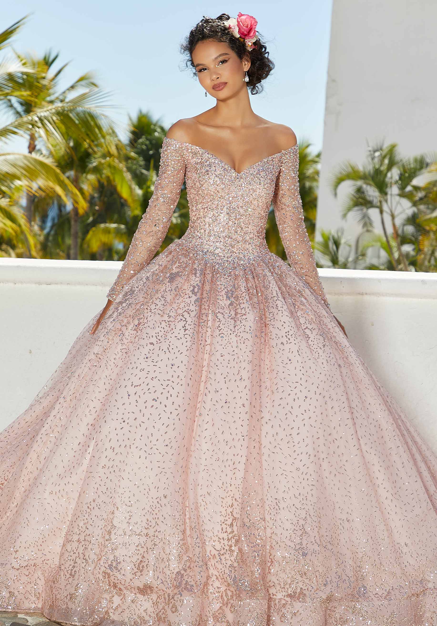 Sparkling quinceañera ball gown in dazzling patterned glitter net features an off-the-shoulder bodice and lovely long sleeves accented with eye-catching crystal beading. Matching stole included.